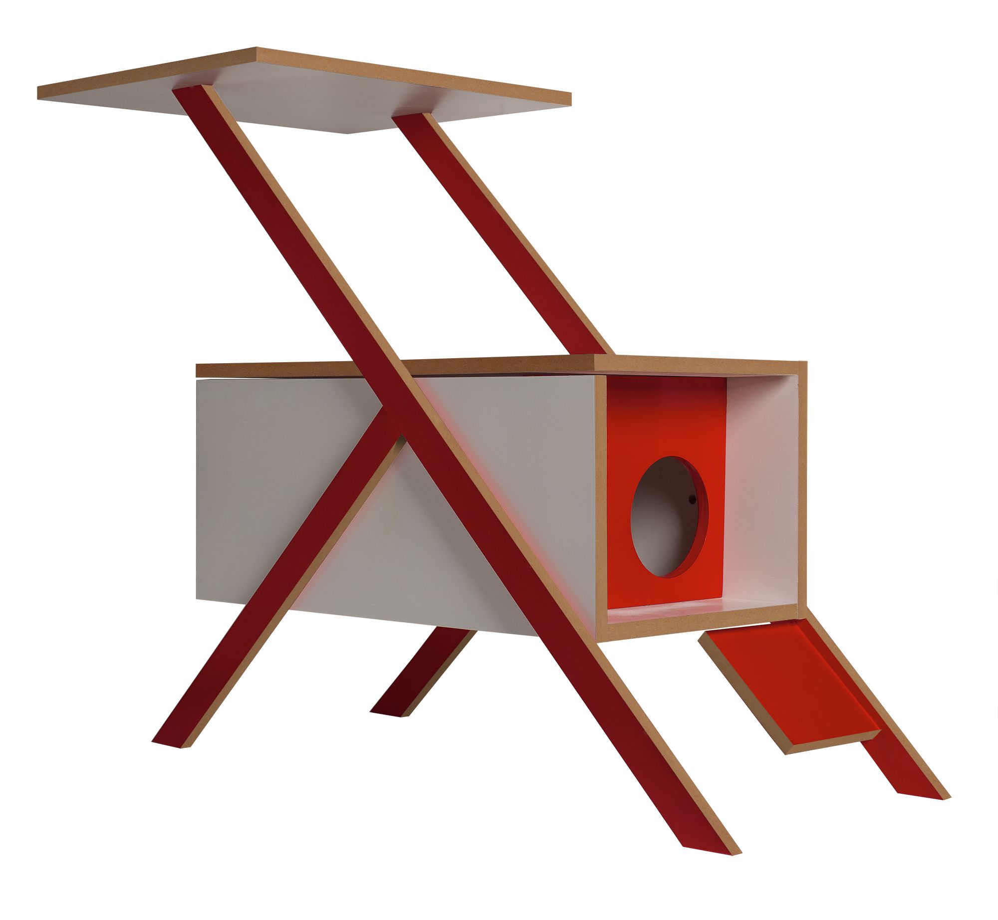 Características: Design moderno, bonito e pensado para as necessidades dos gatos. Possui rampa inclinada revestida de sisal para exercícios e arranhadas e tampa abre e fecha, que transforma a toca também num comedouro.