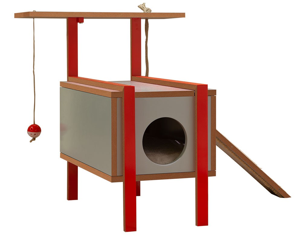 A ideia é ter um espaço de diversão, exercícios e descanso para até 2 gatos simultaneamente. Dispõem de 1 toca grande, 2 terraços em diferentes alturas com acesso para diferentes brincadeiras conjuntas com cordas e bola, além da rampa inclinada forrada de sisal para as “arranhadas”. Incorpora também uma tampa abre e fecha que agrega ao playground também a função de comedouro.